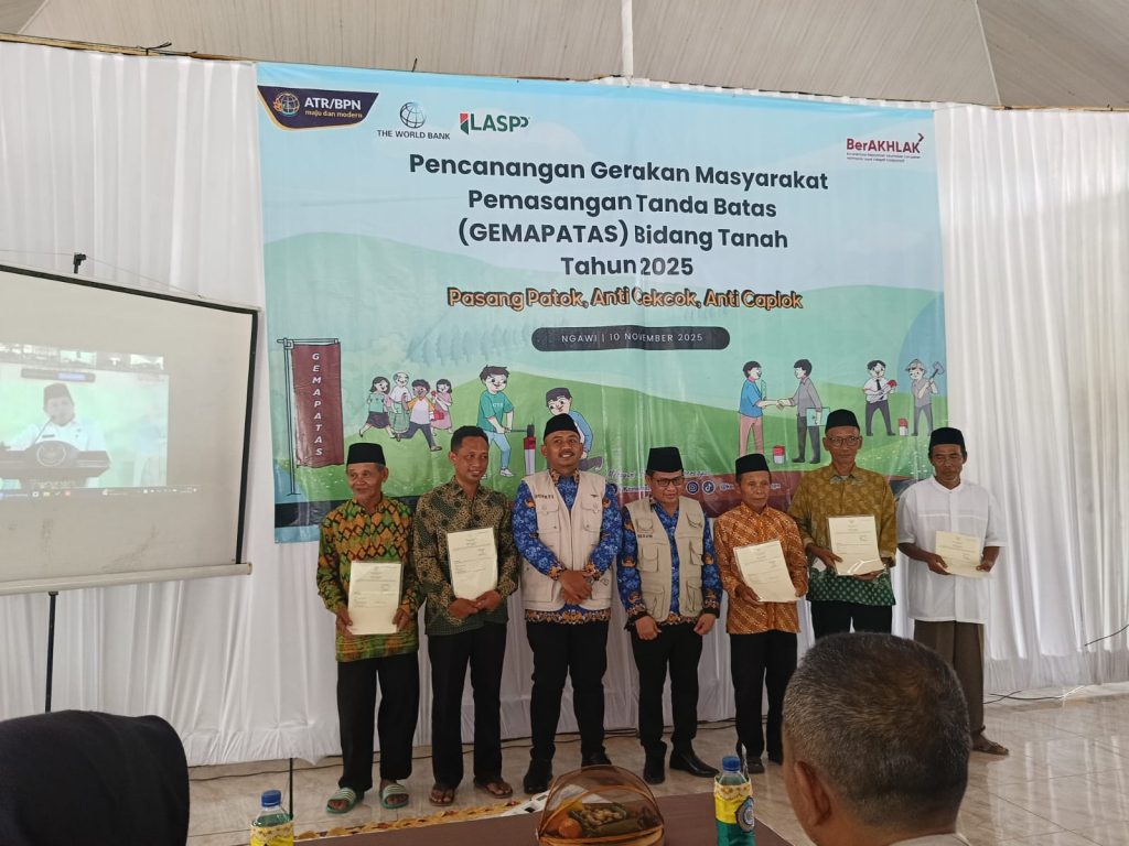 Ngawi, 10 November 2025 Dalam rangka mendukung program nasional dari Kementerian Agraria dan Tata Ruang/Badan Pertanahan Nasional (ATR/BPN), Bupati Ngawi, Bapak Ony Anwar Harsono, S.T., M.H., menghadiri kegiatan GEMAPATAS (Gerakan Masyarakat Pemasangan Tanda Batas) yang diselenggarakan di Balai Pertemuan Yayasan Sakinem Sastro Sentono, Desa Wonokerto, Kecamatan Kedunggalar, Kabupaten Ngawi.
